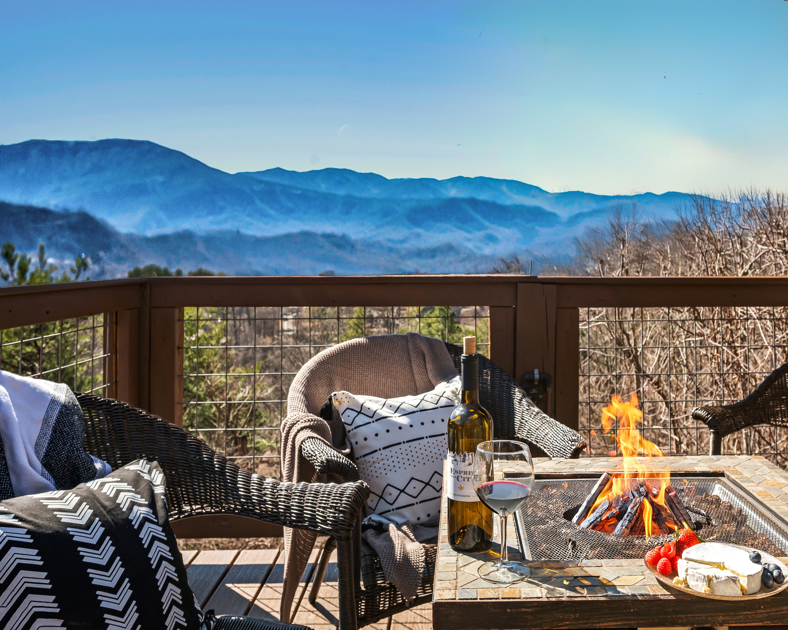 The living room has few large glasses and deck where you can enjoy the awesome views of the mountains.