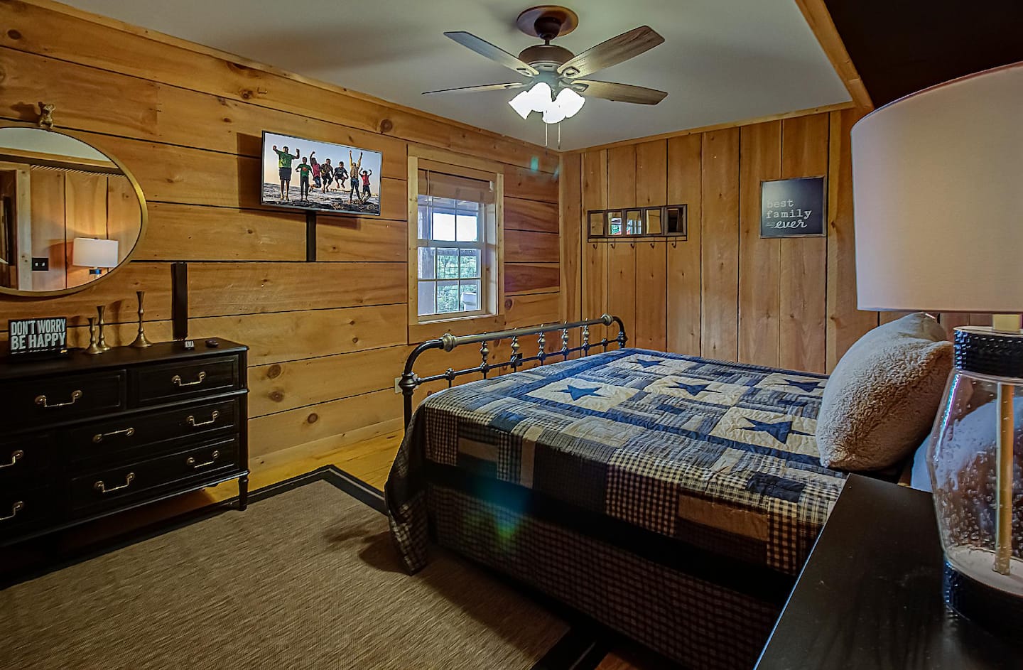 Cozy wooden construction paired with spacious windows and doors, which make the entire cabin extremely bright during the day, create a unique ambiance while allowing you to gaze at the mesmerizing Bluff Mountain. Comfortable furniture and original local decorations make for a comfy home atmosphere.